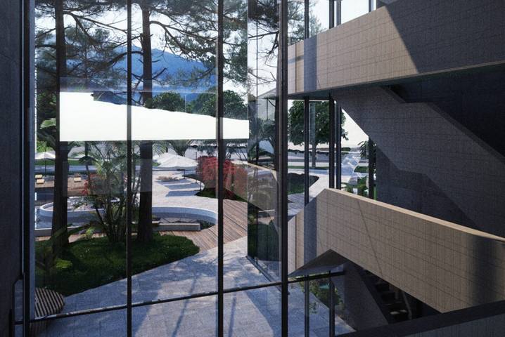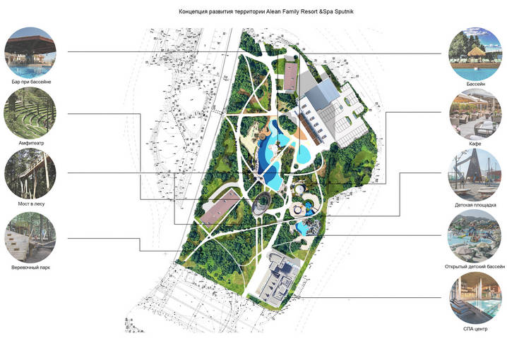 Оздоровительный отельный комплекс Alean Family Resort При разработке Схемы планировочной организации земельного участка, максимально учитывалась существующая геопластика земли. Проектируемые гостиничные корпуса размещены на свободных от зеленых насаждений участках, сдвинуты внутрь территории относительно существующих откосов, примыкающих к границе землеотвода с восточной стороны, на расстояние регламенти- руемое проездом пожарной машины. На территории реконструируемого комплекса в место демон- тируемого здания столовой планируется размещение открытой чаши бассейна общей площадью 1000кв.м., а также детский игровой комплекс с бассейном площадью З20кв.м.
